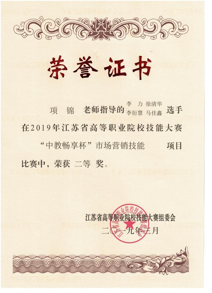 3月7-9日,2019年江苏省高等职业院校技能大赛“中教畅享杯”市场营销技能项目在无锡商业职业技术学院举行。我校商学院代表队获大赛二等奖。