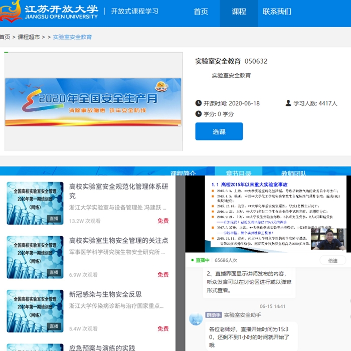 此次活动设有师生共学、教师开讲两大模块。在师生共学方面,一是充分利用我校信息化教学的优势,在开放式课程学习平台中增设《实验室安全教育》微课程供学生学习;二是紧跟新形势下实验室安全管理的热点与难点,积极网罗相关培训资源,组织全校实验室管理人员、技术人员及相关教师参加“全国高校实验室安全管理2020年第一期培训班(网络)”。自学习活动开始以来,在线学生累计2122人次,累计学习时长4841.97小时;累计参与培训人次200余次。在教师开讲方面,各学院有针对性的开设线上实验室安全教育公益讲座10余场、累计观看1000余人次。