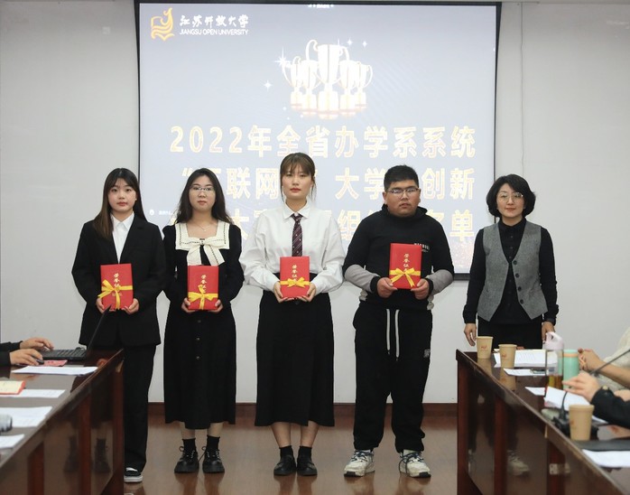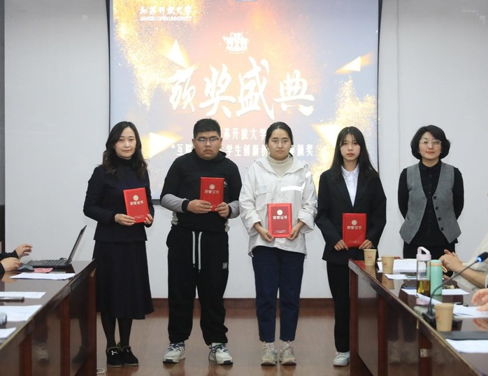 唐荣宣读了《关于表彰2022年“互联网+”大学生创新创业大赛省赛获奖项目的通知》。张晓分别为获奖项目师生代表和优秀组织单位颁发了荣誉证书和奖牌。