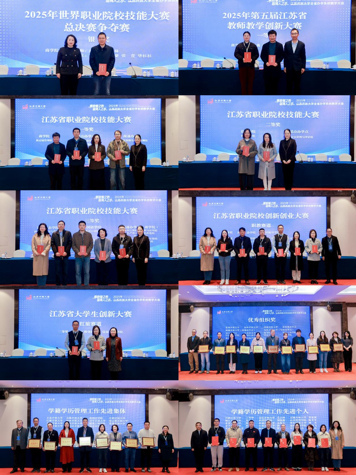 大会现场对学籍学历管理工作先进集体和个人、世界级省级职业院校技能大赛等六类奖项进行集中表彰,张迎春、徐辰与各市开放大学校领导、二级学院及职能部门负责人共同为获奖代表颁奖。